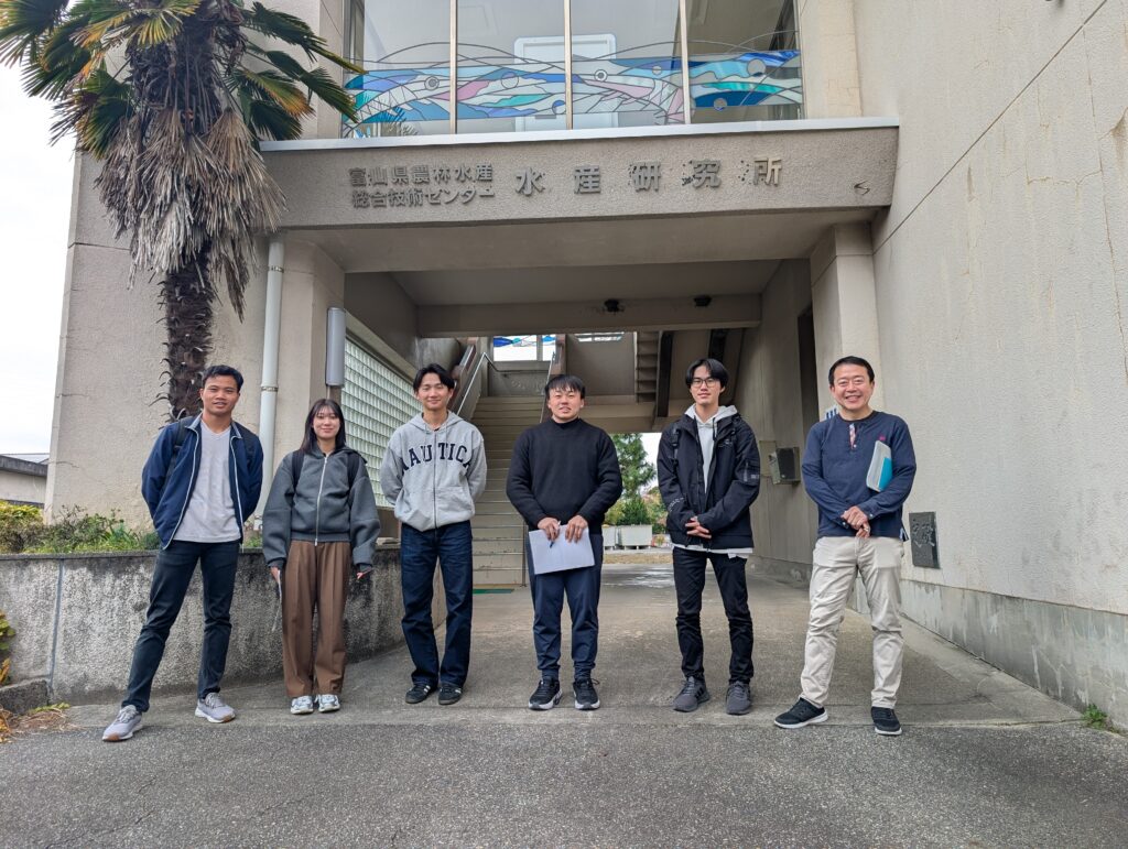 学生さんが水産研究所を訪れた様子が、気候変動適応センターのニュースレターに掲載されました! 投稿日 2025年12月8日 先日、3年生、4年生、大学院生の一部が地域課題クラスで県の水産研究所を訪れました。富山県のブリやサクラマスなどの水産資源が、今後の気候変動にどのように適応していくかを学びました。この様子を気候変動適応センターのニュースレターに掲載していただきました。頑張って取材した学生さんおよびご協力頂いた水産研究所および気候変動適応センターの皆様に感謝感謝です。 ニュースレターの様子はこちらからご確認ください。