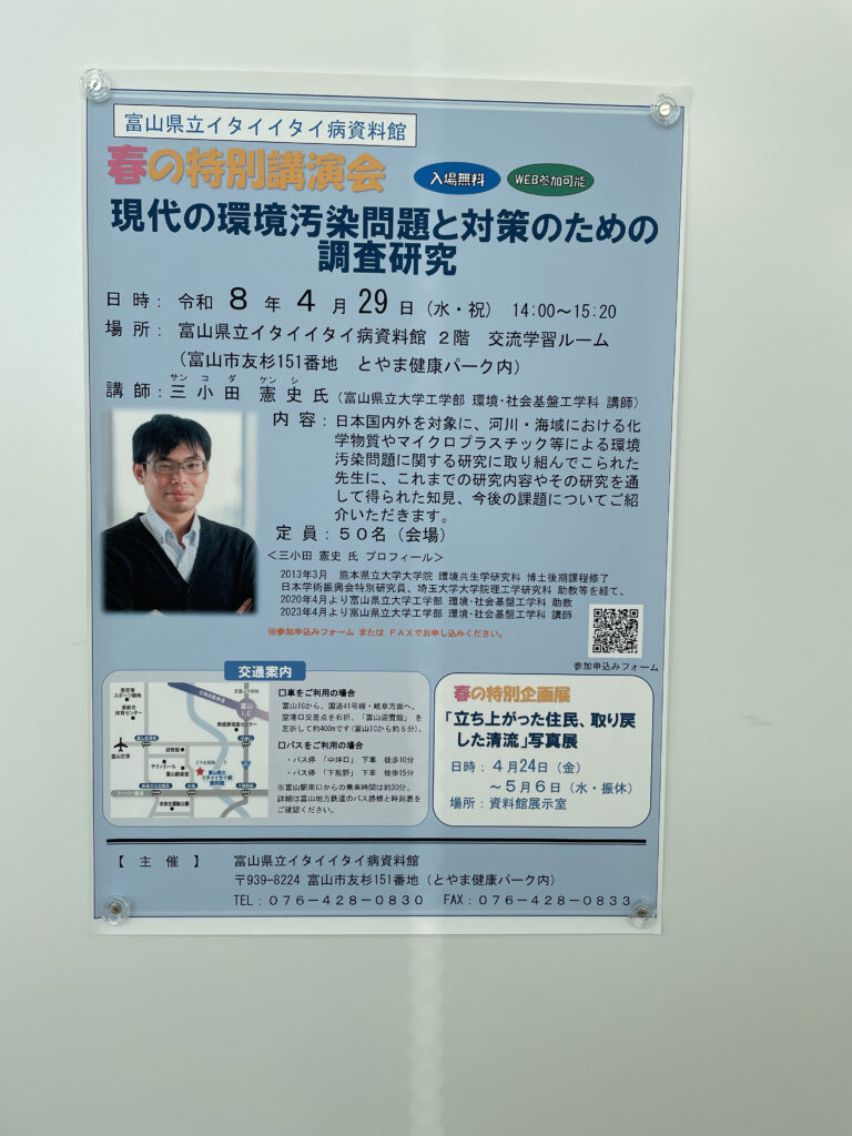 三小田講師が環境汚染問題に関して講演します 投稿日 2026年4月14日 本学科の三小田講師が、4月29日に富山県立イタイイタイ病資料館における春の特別講演会で、「現代の環境汚染問題と対策のための調査研究」と題して講演します。入場無料で、WEB参加も可能です。 参加申し込みはこちらから